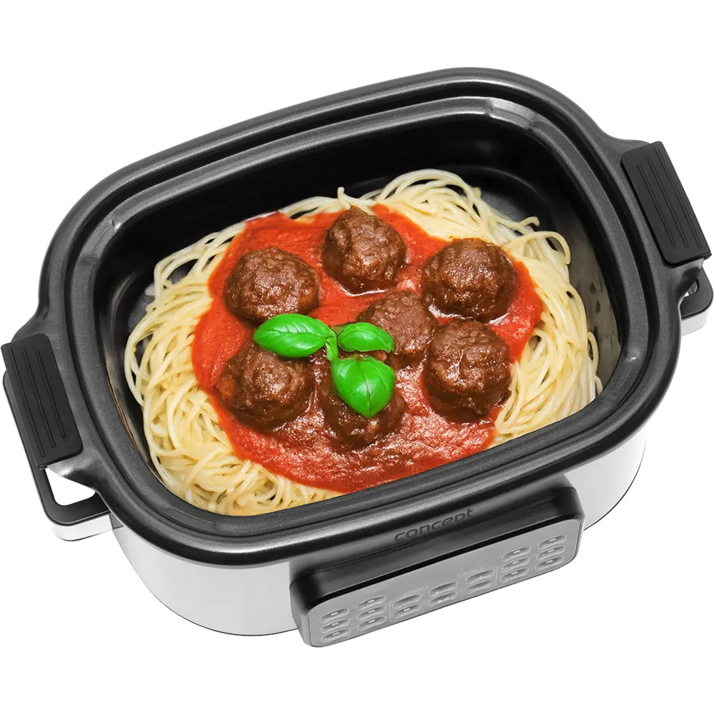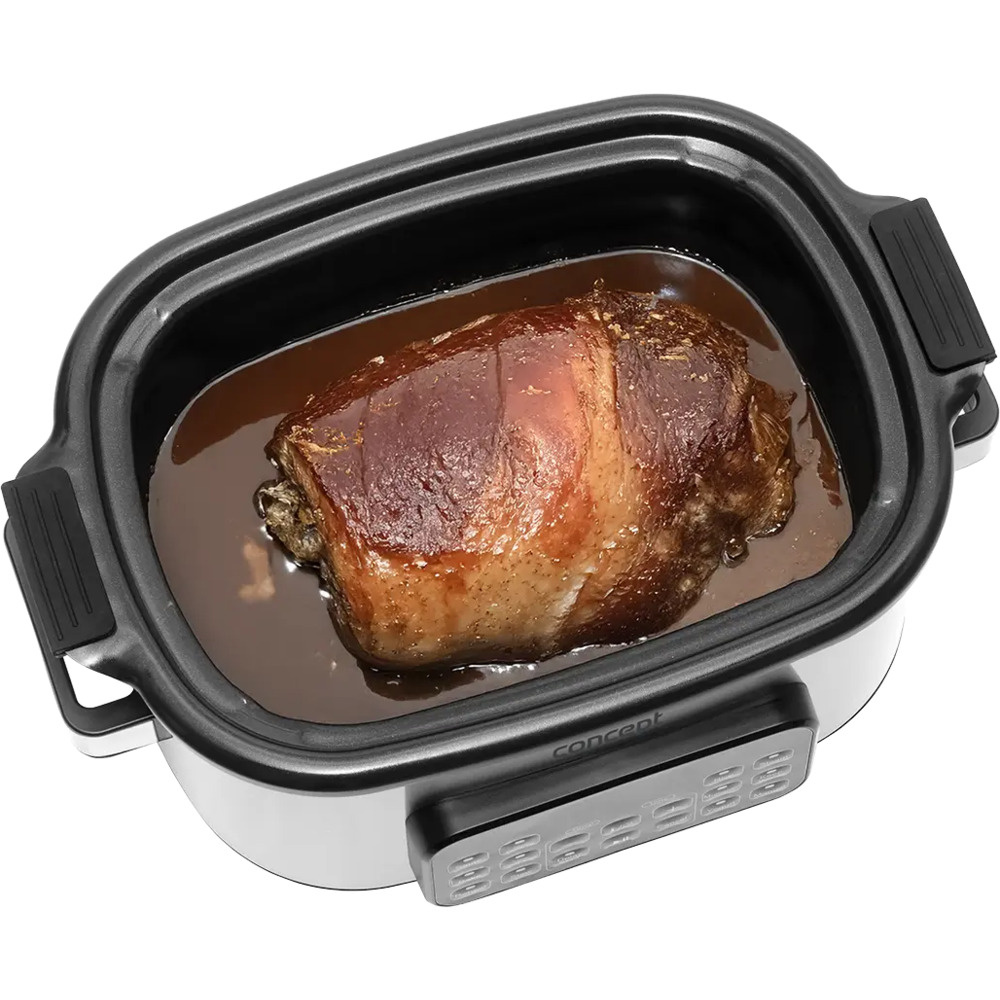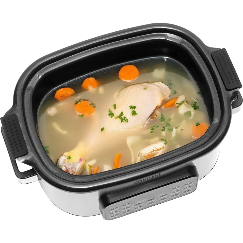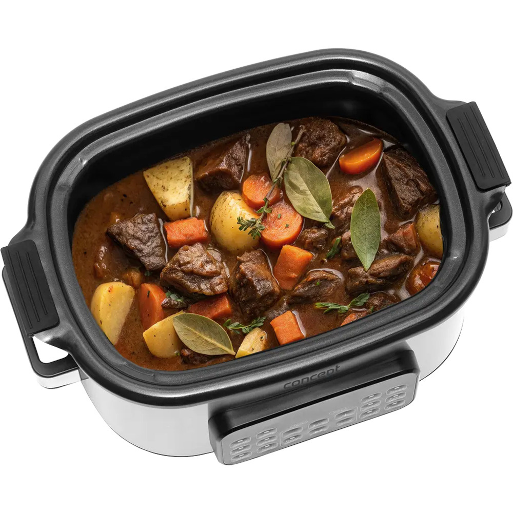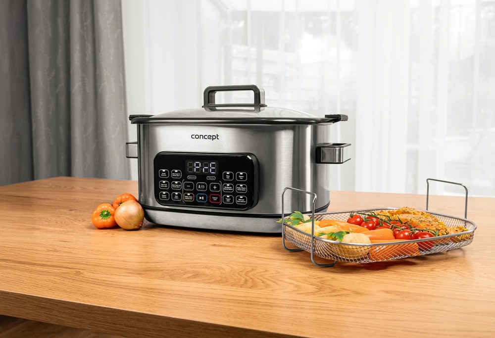 Wielofunkcyjny wolnowar Concept CK9000 to praktyczny pomocnik, który oszczędza czas, energię i miejsce na kuchennym blacie. Oferuje 10 automatycznych programów, w tym powolne gotowanie i gotowanie na parze, dzięki czemu z łatwością poradzi sobie z szeroką gamą potraw. Pokrywa z hartowanego szkła pozwala wygodnie kontrolować gotowanie bez konieczności jej otwierania. Kompaktowy rozmiar sprawia, że kuchenka jest łatwa do przenoszenia - idealna do domków letniskowych lub na wakacje. W zestawie znajduje się mini-książka kucharska z przepisami ułatwiającymi rozpoczęcie gotowania.