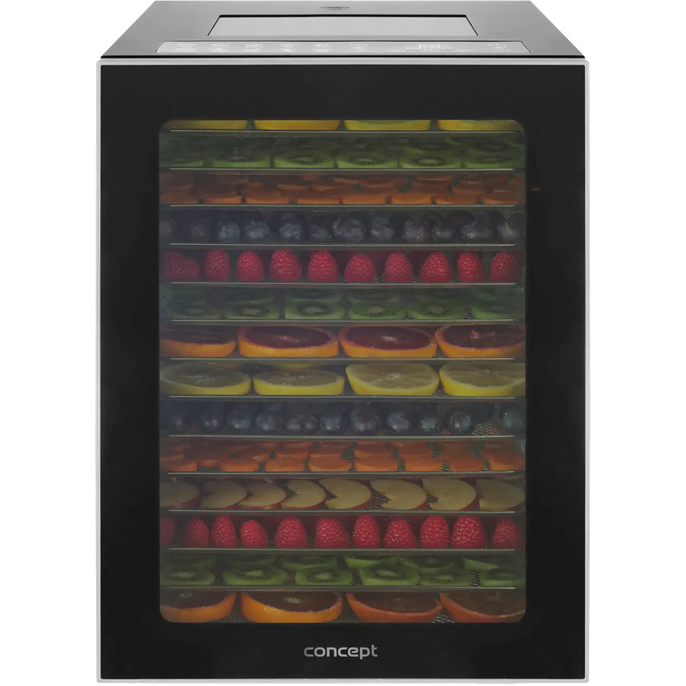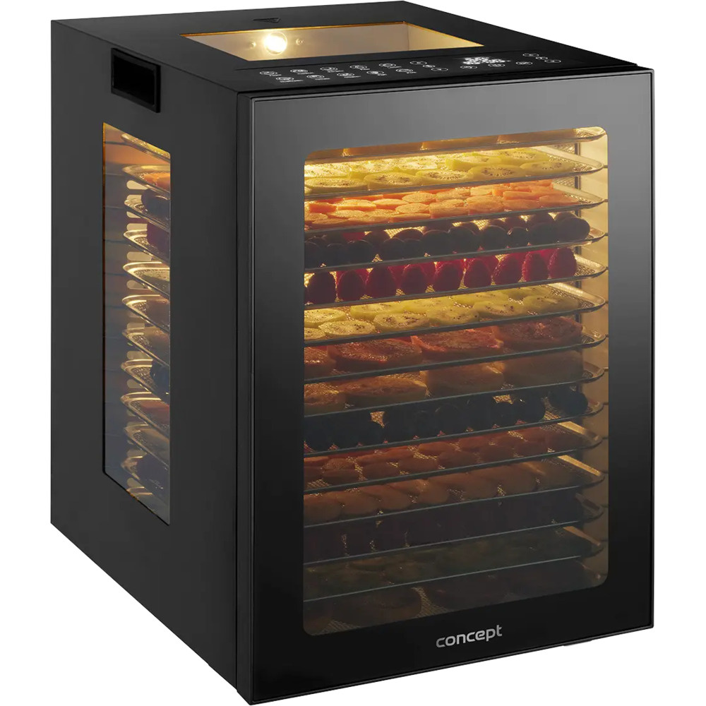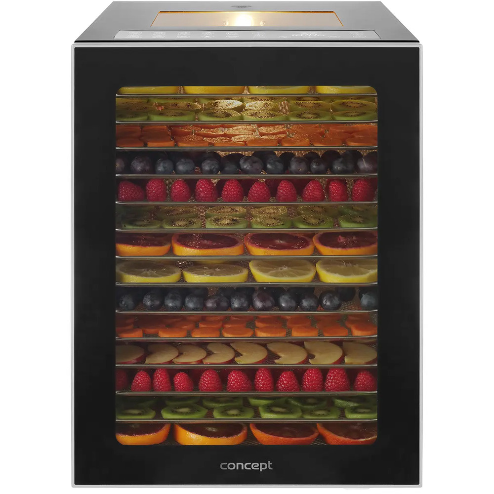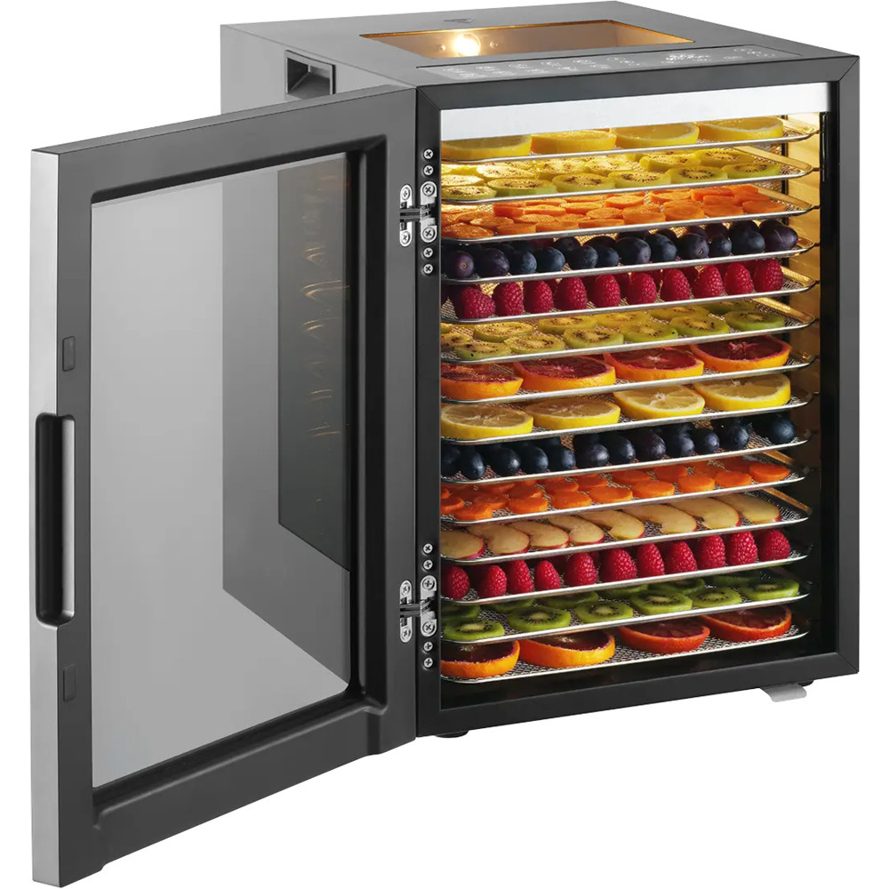 Suszarka do owoców Concept SO5000 z o mocy wejściowej 850 W sprawnie i szybko radzi sobie nawet z dużymi ilościami składników, które można suszyć na suszarce 14 płyt ze stali nierdzewnej. Główną zaletą płyt ze stali nierdzewnej jest ich wysoka trwałość, odporność na bakterie, pleśń i inne mikroorganizmy oraz łatwa konserwacja. Jednocześnie przyspieszenie procesu suszeniaponieważ nagrzewają się podczas pracy. Dzięki poziomemu przepływowi powietrza suszarka gwarantuje równomierne suszenie na wszystkich piętrach. Oświetlenie wewnętrzne i wysuwany system ułatwiają sterowanie.