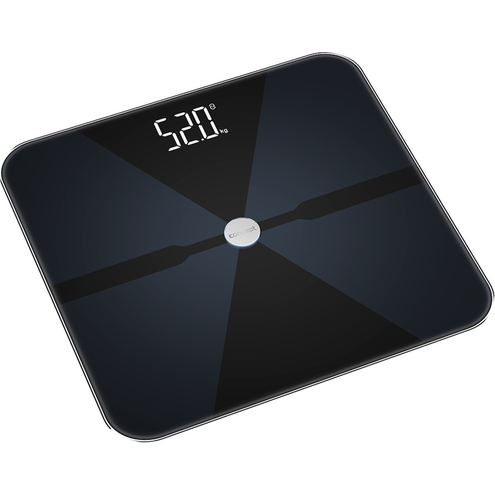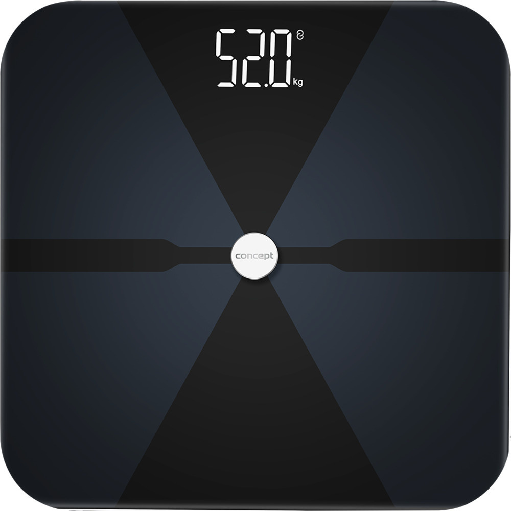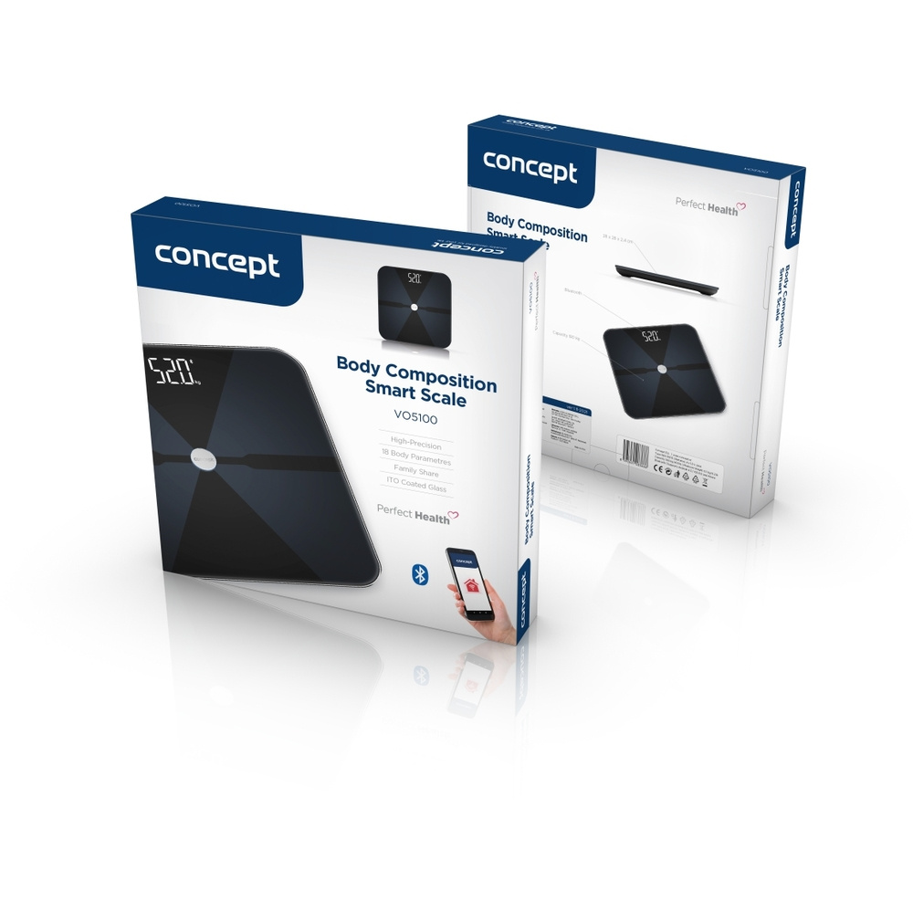 Inteligentna waga osobista Concept VO5100 Perfect Health pomaga śledzić stan zdrowia w prosty i przejrzysty sposób. Oprócz samej masy ciała, zapewnia szczegółową analizę składu ciała, aby zapewnić lepszy obraz kondycji i postępów. Waga ma nośność do 180 kilogramów i mierzy z dokładnością do 100 gramów. Elegancki minimalistyczny design w połączeniu czarnej i ciemnoniebieskiej szklanej płyty o grubości 5 milimetrów oraz niski design sprawiają, że jest to stylowe akcesorium, które naturalnie pasuje do każdej łazienki lub wnętrza.