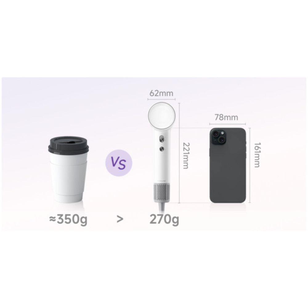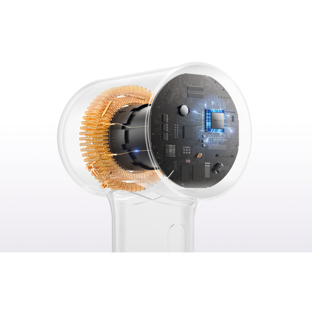 Sercem mini suszarki do włosów Dreame jest zaawansowany silnik o wysokiej prędkości 100 000 obr. Generuje on potężny przepływ powietrza do 70 m/s przy wysokiej prędkości i 55 m/s przy niskiej prędkości. Mimo to urządzenie waży zaledwie 270 gramów i ma średnicę zaledwie 62 milimetrów, zapewniając wygodną obsługę i precyzyjną stylizację.