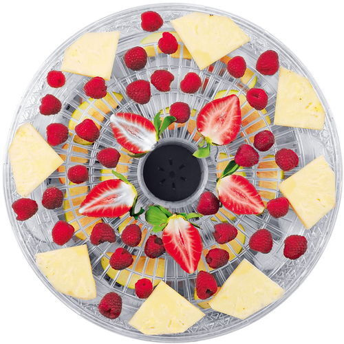 Aby zapewnić doskonałe rezultaty, suszarka jest wyposażona w zintegrowany wentylatorco zapewnia równomierną cyrkulację powietrza na wszystkich piętrach. Jest 9 przejrzystych wynagrodzeń o średnicy 32 cm i specjalnie ukształtowanych kratkach, które zapewniają optymalny przepływ powietrza. Dzięki tej sprytnej konstrukcji uzyskuje się równomierne suszenie wszystkich składników, niezależnie od tego, czy suszysz grzyby, owoce czy przygotowujesz przysmaki RAW. Ponadto przezroczysta konstrukcja półmiska ułatwia kontrolę procesu suszenia.