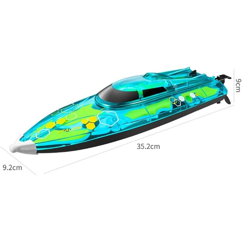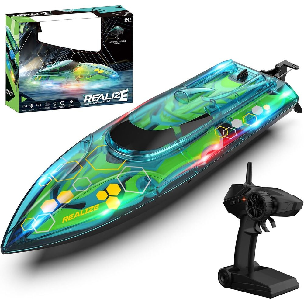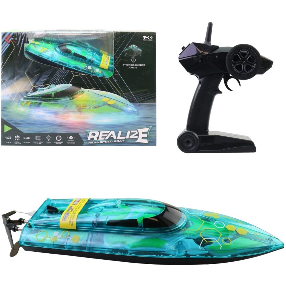 Zdalnie sterowana łódź wyścigowa Ssccgym h155 prezentuje zielona motorówka z pełnym oświetleniem LEDktóre mogą osiągnąć prędkości 20-28 km/h na powierzchni. Model jest przeznaczony dla entuzjastów w wieku od 14 lat i oferuje precyzyjną kontrolę poprzez system 4CH 2.4G z zasięgiem do 150 metrów. Wymiary statku 35,2 x 9,2 x 9 cm dostępne pod adresem wodoodporny kadłub wykonany z odpornego na uderzenia tworzywa ABS z modułową konstrukcją zapobiegającą przechylaniu, która zapewnia stabilność nawet przy wyższych prędkościach. Elementy sterujące typu pistoletowego umożliwiają ruch do przodu, do tyłu, w lewo i w prawo, w tym 180° precyzyjnego obrotuprzy czym inteligentny system automatycznie wysyła alarm w przypadku przekroczenia dystansu lub rozładowania baterii. Energia jest dostarczana przez bateria litowa 7,4 V 600 mAh z wytrzymałością 20 minut żeglowania i czas ładowania 180 minut przy użyciu dołączonego kabla USB z zabezpieczeniem. Wbudowany system chłodzenia wodą chroni silnik przed przegrzaniem podczas wyścigów. W zestawie znajduje się łódka ze sterownikiem, kabel do ładowania, zapasowe śmigło o średnicy 2,9 cm, stojak i instrukcje. Sterownik wymaga 2x baterie AA 1,5 Vktóre nie są zawarte w dostawie. Ten model w skali 1:28 to idealny wybór do jezior, stawów i basenów.