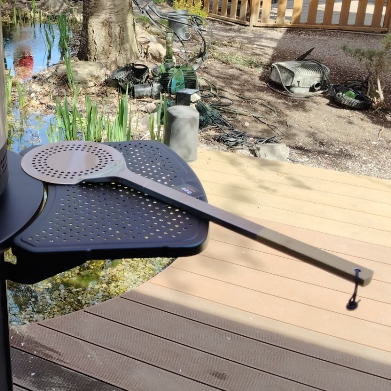 Perforowana łopatka do pizzy ze stali nierdzewnej z bardzo długim uchwytem do pieców do pizzy Solo Stove. Idealna do zdejmowania gotowych pizz i placków z gorącego kamienia do pieczenia. Drewniany uchwyt łopatki doskonale leży w dłoni.