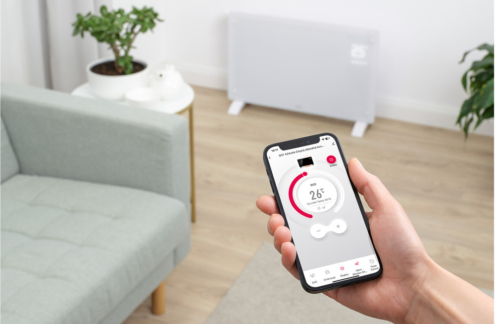 Konwektor oferuje trzy tryby działania - ECO, Comfort i Antifrost, z maksymalną mocą do 2000 W. Unikalny aluminiowy element grzejny w kształcie litery "X" zapewnia szybkie nagrzewanie i wydajną dystrybucję ciepła. Termostat umożliwia precyzyjną regulację temperatury w zakresie 5-50°C. Tryb Antifrost automatycznie włącza ogrzewanie, gdy temperatura spadnie poniżej 5°C i utrzymuje ją powyżej tego progu. Sterowanie jest możliwe za pomocą panelu dotykowego, dołączonego pilota zdalnego sterowania lub za pośrednictwem aplikacja SENCOR HOME. Oprócz podstawowych funkcji oferuje zaawansowane opcje, takie jak 24-godzinny timer i tygodniowe programowanie scenariuszy ogrzewania.