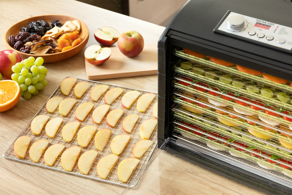 Odkryj wyjątkową suszarkę Sencor SFD 6601BK z całkowitą powierzchnią suszenia 1,18 m²która jest o 65% większa od konwencjonalnych suszarek o średnicy 32 cm. Unikalna kombinacja sześciu płyt z tworzywa sztucznego i sześciu płyt ze stali nierdzewnej, uzupełniona specjalną pełną płytą, umożliwia suszenie do 6 kg surowców jednocześnie. Każda taca może pomieścić do 500 g żywności, co docenisz zwłaszcza podczas przetwarzania większych zbiorów.