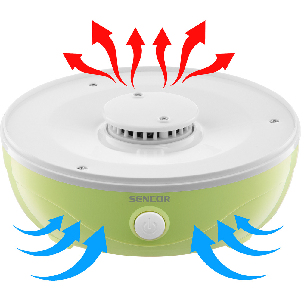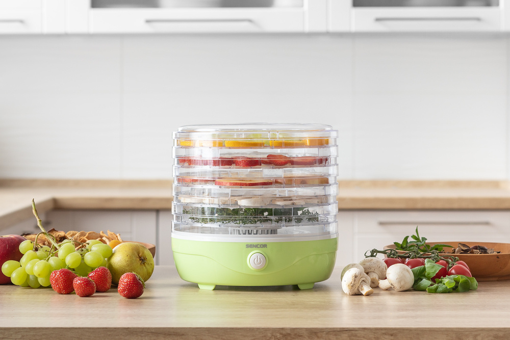 Model SENCOR SFD 757GG oferuje pięć praktycznych wynagrodzeń ze średnią 23 cm i regulowaną wysokość do 2,5 cm. Dzięki możliwości korzystania z jednej płyty suszarka jest bardzo elastyczna. Wbudowany wentylator zapewnia optymalną cyrkulację gorącego powietrza na wszystkich piętrach suszarki, a specjalna konstrukcja płyt pozwala na wydajny przepływ powietrza i równomierne suszenie wszystkich składników.