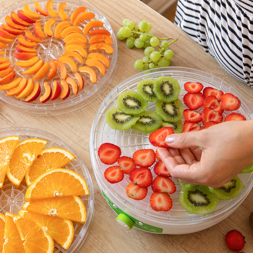 Suszarka oferuje bezstopniową regulację temperatury w zakresie 35-80 °C za pomocą podświetlanego kontrolera obrotowego. Może obsługiwać szeroką gamę produktów spożywczych - od owoców i warzyw, przez grzyby i zioła, po przygotowywanie specjałów mięsnych. Nadaje się również do suszenia pestek dyni, przygotowywania domowych mieszanek herbat lub wykonywania dekoracji.
