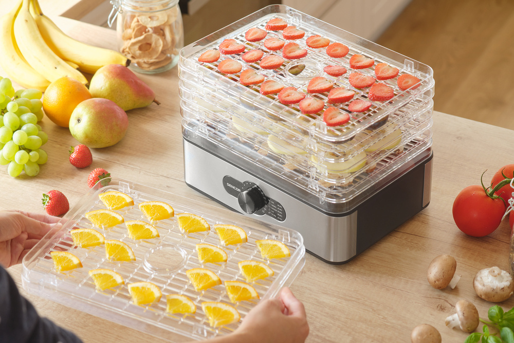 Model SENCOR SFD 950SS oferuje pięć żaroodpornych płyt z tworzywa sztucznego o wymiarach 29 x 20 cm. Unikalna konstrukcja umożliwia regulację wysokości tac do 16 lub 29 mm w zależności od rodzaju suszonej żywności. Zintegrowany wentylator zapewnia optymalną cyrkulację gorącego powietrza na wszystkich piętrach suszarki, a specjalna konstrukcja kratki tacy suszącej zapobiega powstawaniu pleśni i optymalizuje przepływ powietrza.