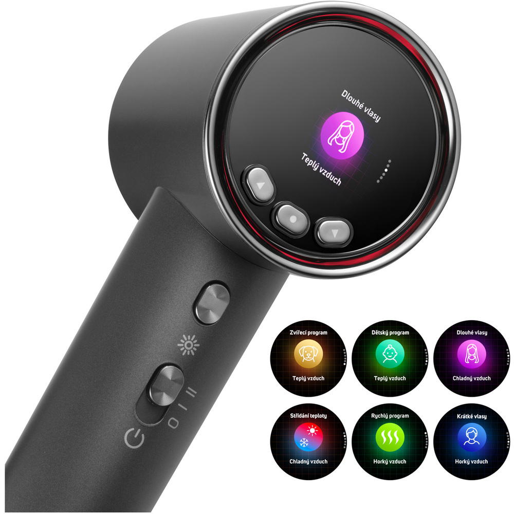 Suszarka oferuje 5 wyspecjalizowanych trybów: szybki program dla czasochłonnych poranków, zmianę temperatury dla delikatnego suszenia, specjalne ustawienia dla długich i krótkich włosów. Docenisz również program dziecięcy, bezpieczny w Używaniu od ósmego roku życia oraz program zwierzęcy, odpowiedni dla zwierząt domowych. Strumień zimnego powietrza pomaga utrwalić i wzmocnić fryzurę.