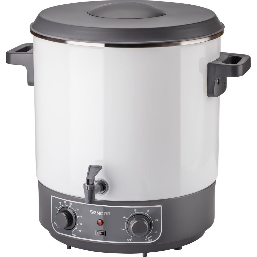 Bezpieczeństwo pracy jest zapewnione przez podwójna ochrona bezpieczeństwaz zabezpieczeniem przed przegrzaniem i bezpiecznikiem bez obciążenia. Garnek jest wyposażony w bezstopniowo regulowany termostat w zakresie 30-100 °C z automatyczną kontrolą temperatury. Praktyczny kratka do słoików o średnicy 31,1 cm. Po osiągnięciu ustawionej temperatury włącza się alarm dźwiękowy, aby powiadomić użytkownika o zakończeniu procesu. Przy całkowitej wysokości 45,5 cm i średnicy garnka 38 cm, zapewnia wystarczającą przestrzeń do wygodnej obsługi podczas konserwowania i regularnego gotowania.