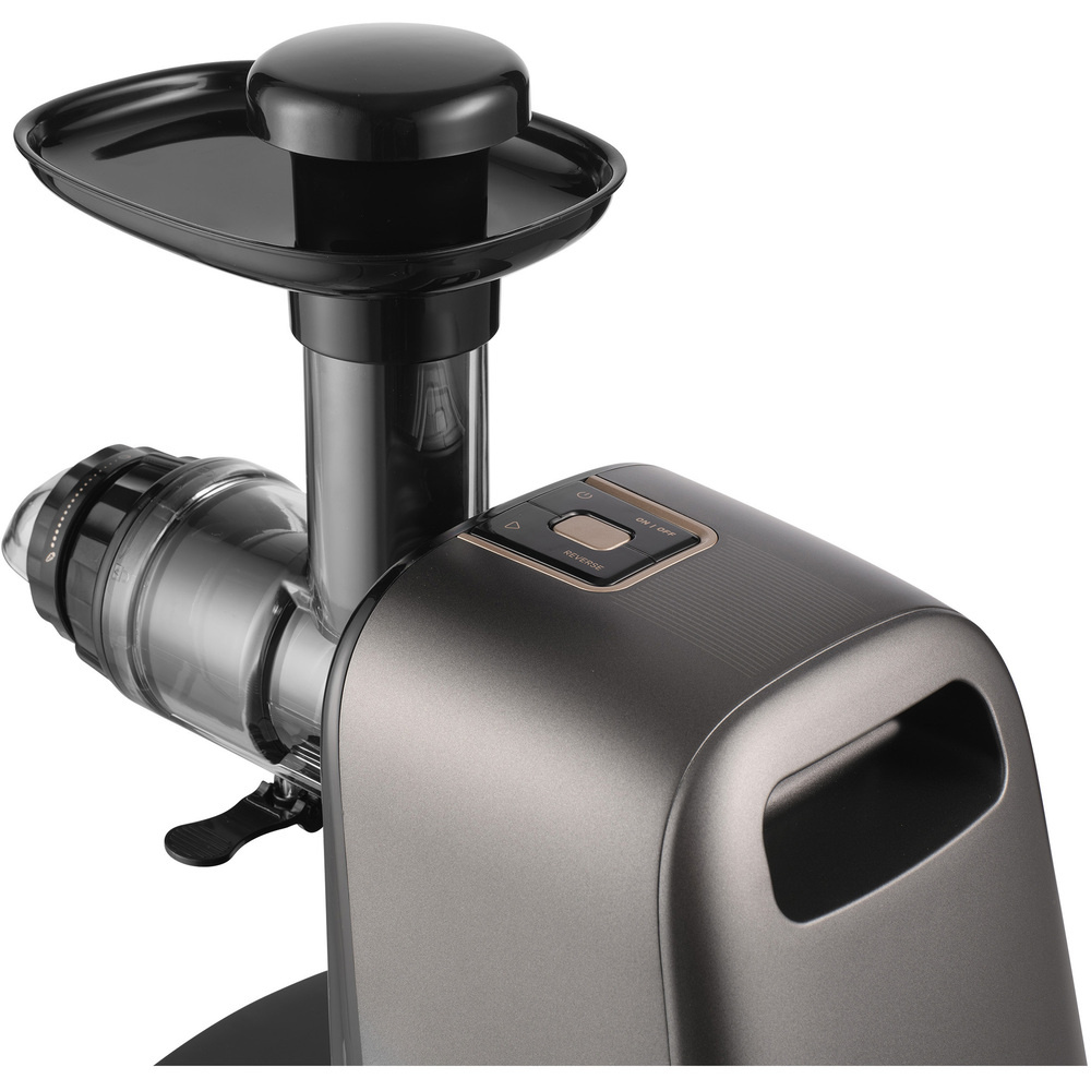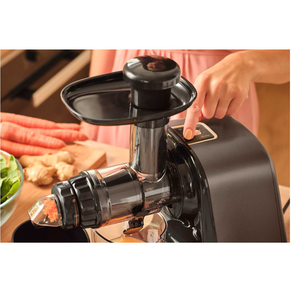 Wytrzymały ślimak do wyciskania soków napędzany mocnym silnikiem DC o mocy 150 W i niezwykle cichej pracy z łatwością przetwarza nawet najtwardsze składniki. SSJ 0900BK to jedna z najcichszych wyciskarek w swojej kategorii. Poręczny przycisk REV przełącza silnik na bieg wsteczny, szybko uwalniając wszelkie zablokowane składniki i zapewniając ciągły komfort pracy.