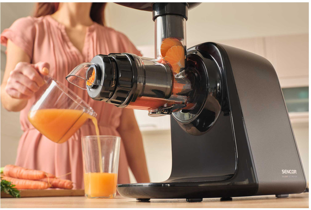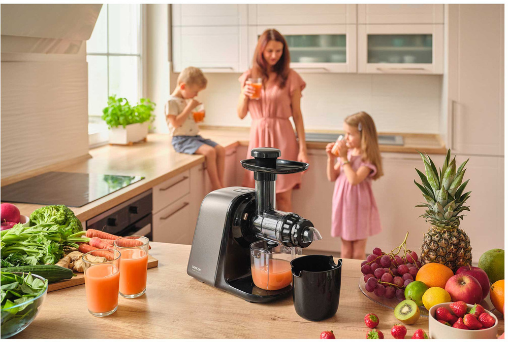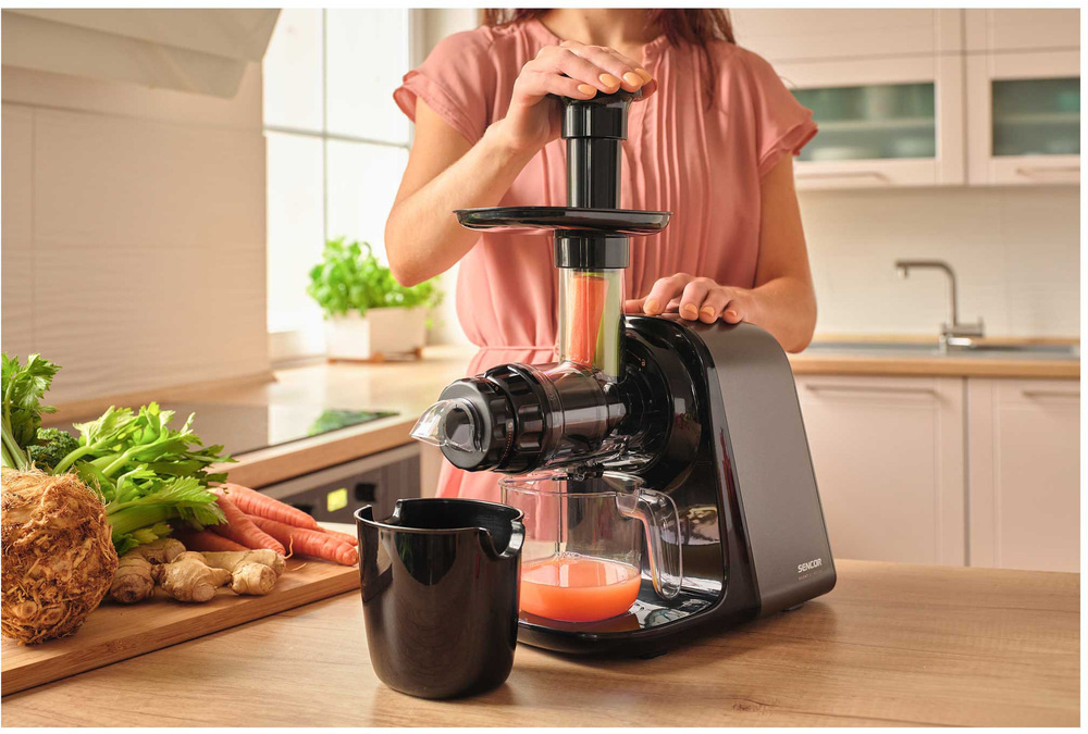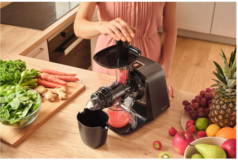 Sokowirówka ślimakowa SSJ 0900BK posiada rewolucyjny mechanizm wolnoobrotowy pracujący z prędkością zaledwie 65-80 obrotów na minutę. Technologia ta zapewnia delikatne przetwarzanie jabłek, owoców cytrusowych, owoców egzotycznych, porzeczek, marchwi i warzyw liściastych. Dzięki precyzyjnemu wyciskaniu otrzymujesz świeży, pełen witamin sok z minimalną ilością piany i maksymalnym smakiem.