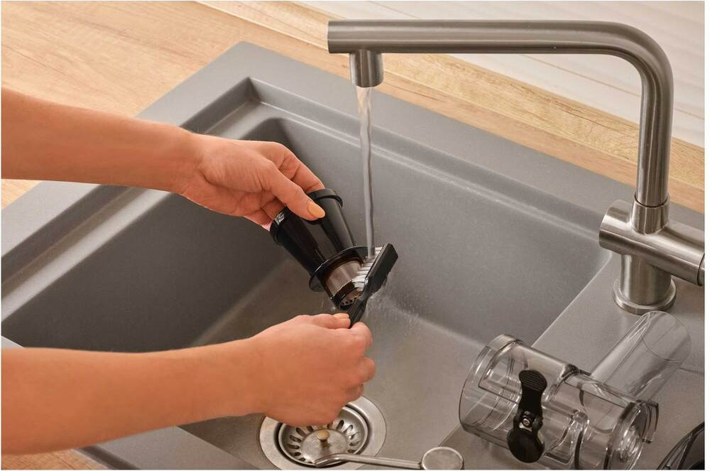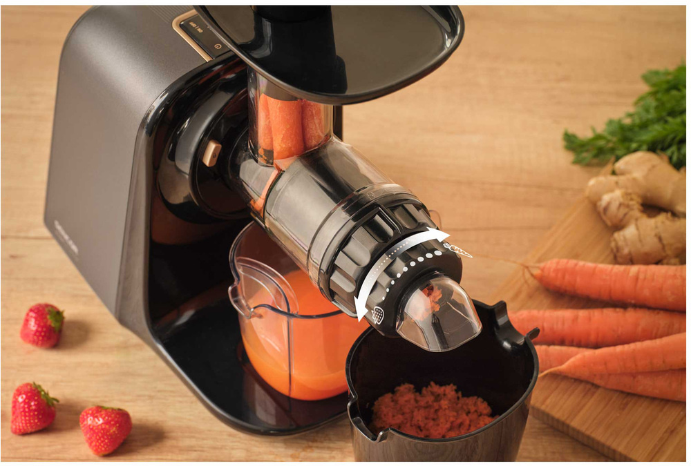 Dzięki regulatorowi pulpy można łatwo dostosować ilość pozostałej pulpy do rodzaju surowca - od miękkich owoców po twarde warzywa. Zapewnia to zawsze idealną wydajność. Urządzenie jest wyposażone w system zapobiegający kapaniu oraz pojemniki o pojemności 550 ml na sok i 700 ml na pulpę. Po Używaniu można szybko zdemontować plastikowe części, aby umyć je w zmywarce, wraz z poręczną szczotką do czyszczenia.