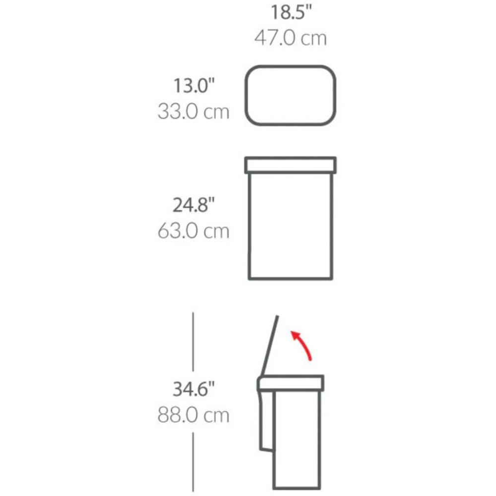 Pojemność 58 litrów pomieści odpady dużych rodzin, a wymiary 47 × 33 × 63 cm gwarantują optymalne wykorzystanie przestrzeni. Kosz można zasilać za pomocą zasilacza sieciowego lub 6 baterii AA. Simplehuman wykorzystuje materiały najwyższej jakości i udziela na ten model 5-letniej gwarancji.