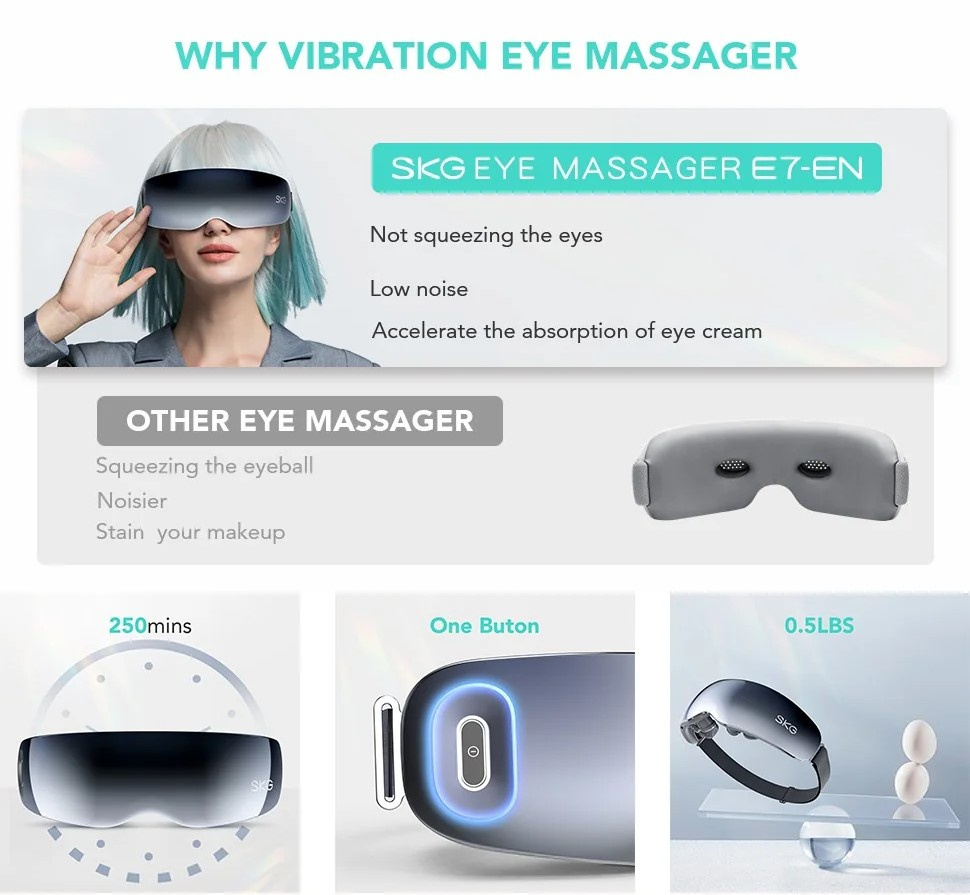 Podaruj sobie chwile relaksu i regeneracji z masażerem SKG E7-EN. Masażer oczu i skroni SKG E7-EN to codzienna ulga dla zmęczonych oczu i skroni. Jeśli Twoje oczy są suche, pieką, a głowa nieustannie boli po długich godzinach spędzonych przed ekranem komputera lub telewizora, masażer SKG E7-EN jest idealnym rozwiązaniem. Masażer posiada 12 głowic masujących z 4 trybami pracy: pchanie, ugniatanie, bicie i stukanie, które naśladują profesjonalny masaż ręczny i zastępują tradycyjne techniki manualne. Tryby te zostały starannie zaprojektowane, aby zapewnić kompleksową pielęgnację okolic oczu i skroni, a każdy z nich jest ukierunkowany na inne aspekty zmęczenia i napięcia.