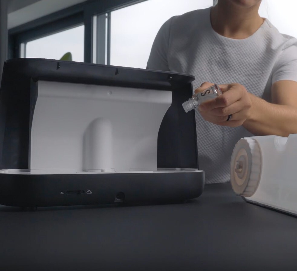 Posrebrzana kostka do dezynfekcji Water Cube zapewnia higieniczne nawilżanie bez rozwoju bakterii. Jeśli woda jest zbyt twarda, zalecamy zakup wkład zmniejszający osadzanie się kamienia Wkład Anticalc. Gwarantuje to, że na meblach wokół nawilżacza Ben nie pozostaną żadne ślady.