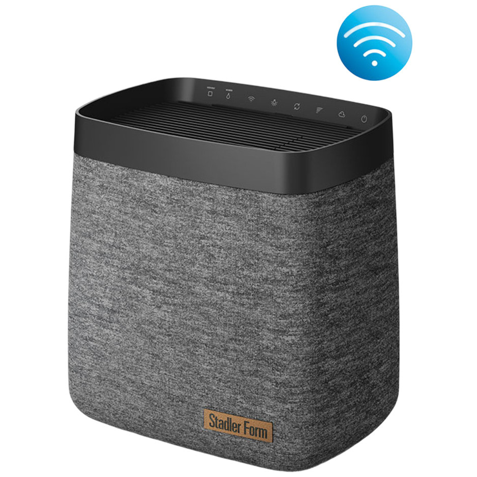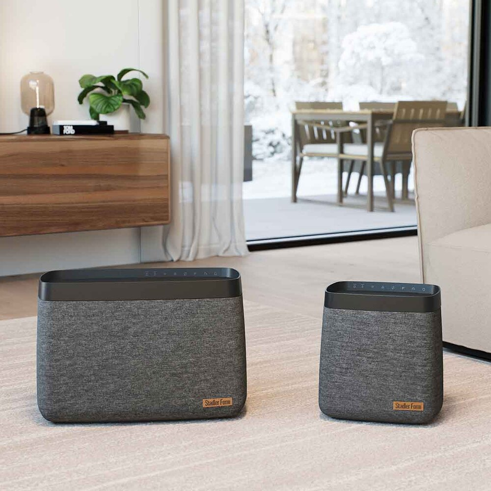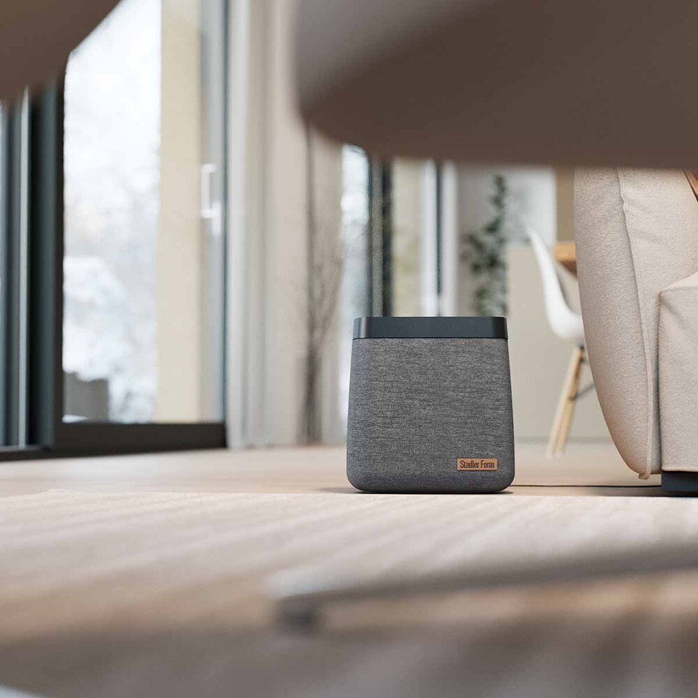 Niepowtarzalny, elegancki, premium. Taki właśnie jest design nawilżacza Karl. Będzie przyciągał wzrok szara powierzchnia tekstylna i subtelne logo Stadler Form na brązowej skórze. Elementy sterujące i wskaźniki LED są ukryte wewnątrz górnego panelu. Nie koliduje to z unikalną konstrukcją nawilżacza Karl.