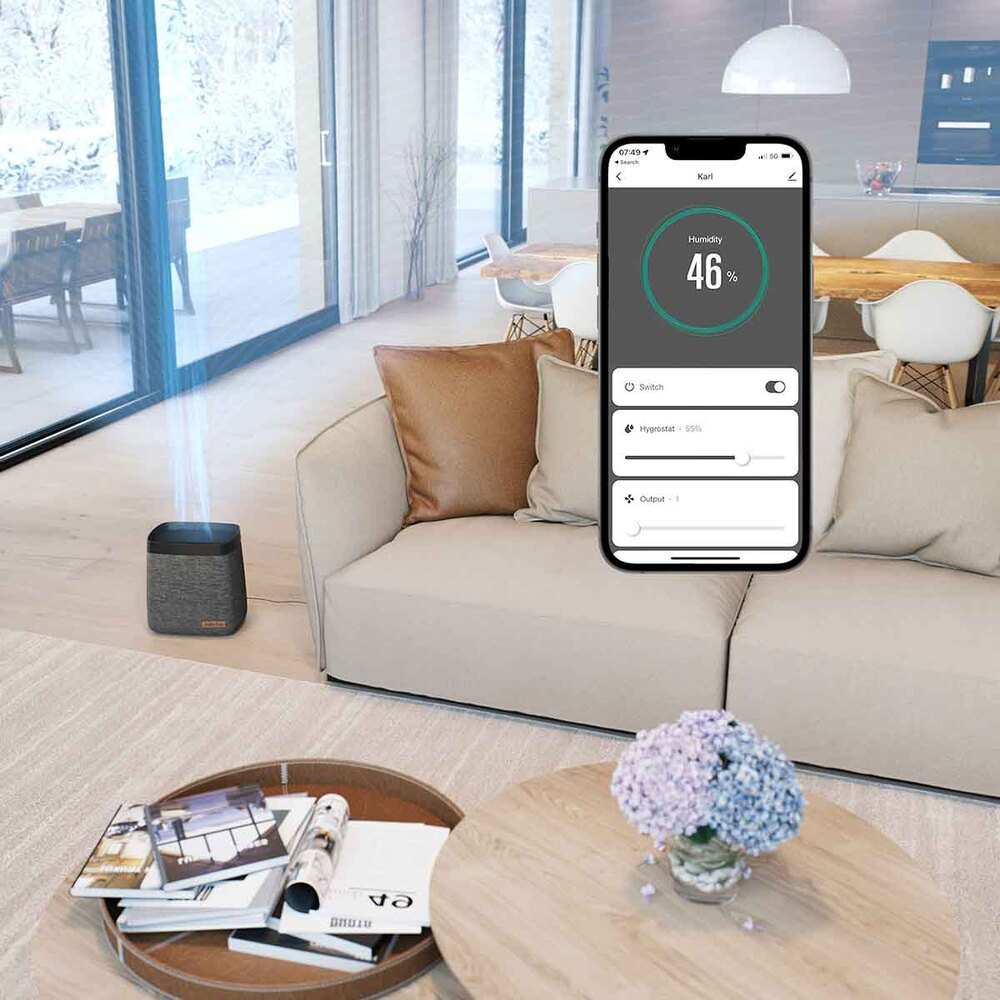 Korzystanie z aplikacje mobilne Stadler Form może sterowanie wszystkimi funkcjami nawilżacza karl i monitoruj aktualną wilgotność w domu w dowolnym miejscu i czasie. Za pomocą aplikacji można ustawić żądana wilgotność, timer, tryb automatyczny, lub zamek dla dzieci.