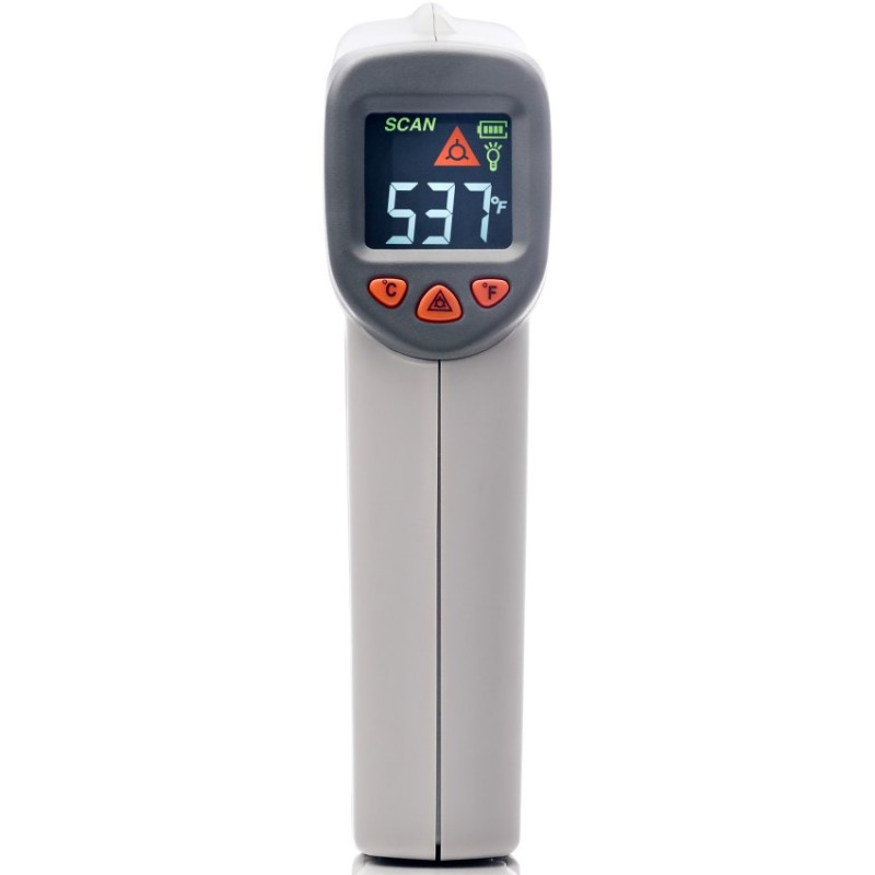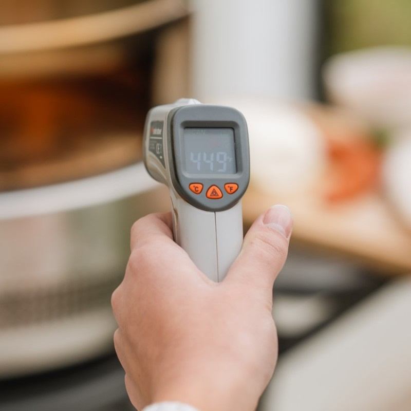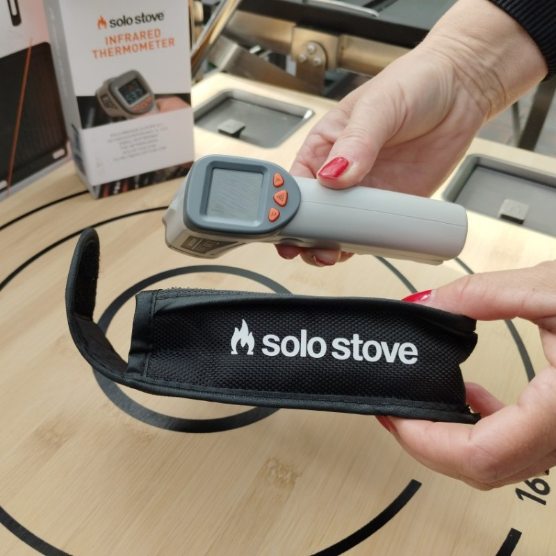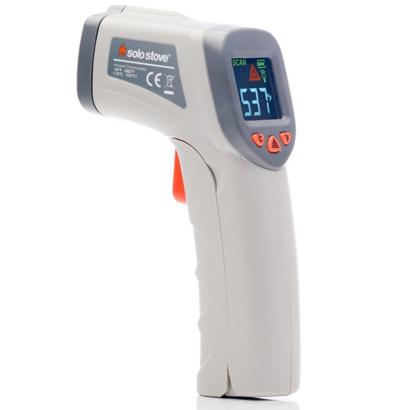 Bezdotykowy, cyfrowy termometr na podczerwień Solo Stove do dokładnego pomiaru temperatury podczas grillowania. Temperaturę można zobaczyć na kolorowym wyświetlaczu praktycznie natychmiast po skierowaniu na obiekt i naciśnięciu przycisku. Dzięki podświetlanemu wyświetlaczowi nie będzie problemu z odczytaniem temperatury nawet podczas wieczornego grillowania. Automatyczne wyłączanie termometru zmniejsza zużycie energii. Termometr w kształcie pistoletu jest bardzo łatwy w trzymaniu i obsłudze. Nie należy kierować wiązki podczerwieni w stronę oczu - nie jest przeznaczony do pomiaru temperatury u ludzi i zwierząt.