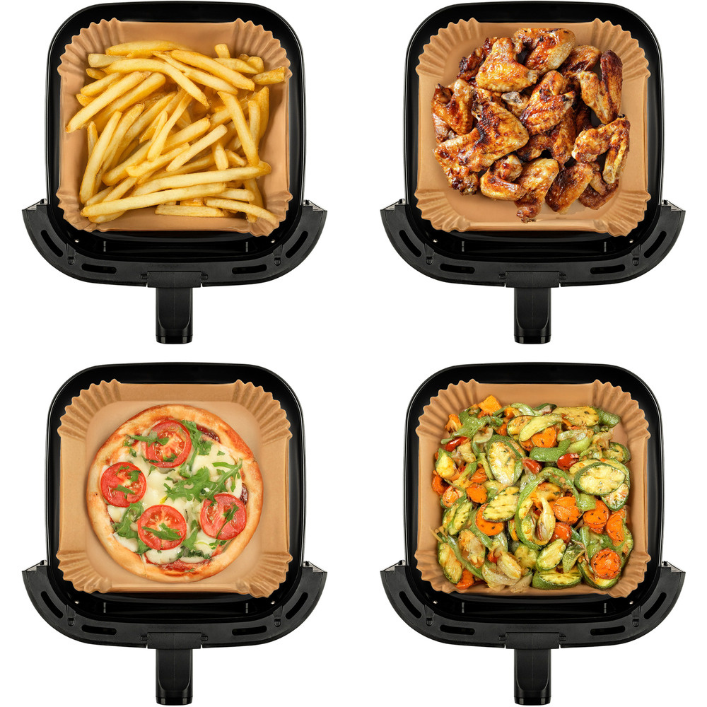 Papierowa forma do frytownic na gorące powietrze chroni kosz frytownicy na gorące powietrze przed resztkami jedzenia, plamami oleju i zadrapaniami. Przedłuża żywotność kosza, ułatwiając czyszczenie i konserwację frytkownicy, zwłaszcza podczas przygotowywania frytek, smażonych skrzydełek itp. Do stosowania w temperaturach do +220°C.