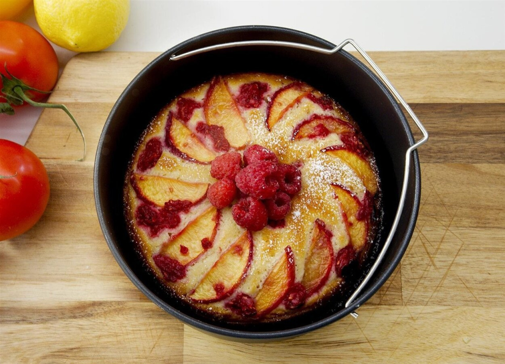 Dzięki formie do ciast frytkownica na gorące powietrze staje się prawdziwie wszechstronnym pomocnikiem kuchennym. Upiecz pachnące ciasto owocowe, puszyste ciasto czekoladowe, uczciwy domowy chleb lub przerób resztki warzyw na pikantny placek. Forma jest wyposażona w praktyczny uchwyt ułatwiający wyjmowanie jej z frytkownicy. Podobnie jak w przypadku formy do pizzy, docenisz trwałą, nieprzywierającą powierzchnię formy do ciasta.