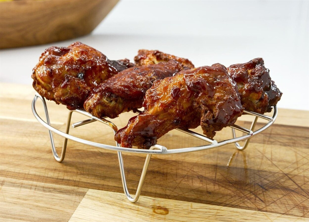 W zestawie akcesoriów do frytownicy na gorące powietrze Cosori znajdziesz również stojak ze stali nierdzewnej, którego możesz używać zwłaszcza podczas przygotowywania mięsa, ryb lub szaszłyków. Stojak umożliwia przepływ gorącego powietrza od spodu, dzięki czemu uzyskuje się naprawdę równomiernie ugotowane danie.