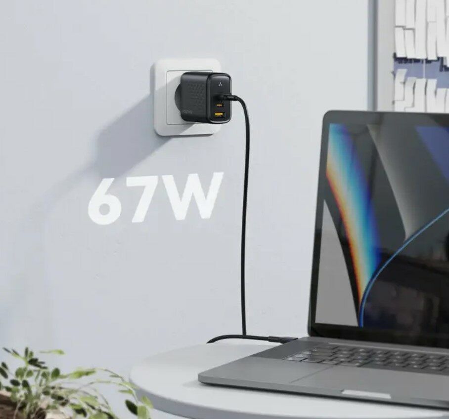 Całkowita moc 67W: Umożliwia szybkie ładowanie laptopów, tabletów i smartfonów. Na przykład MacBook Pro 13" można naładować do 50% w zaledwie 30 minut.