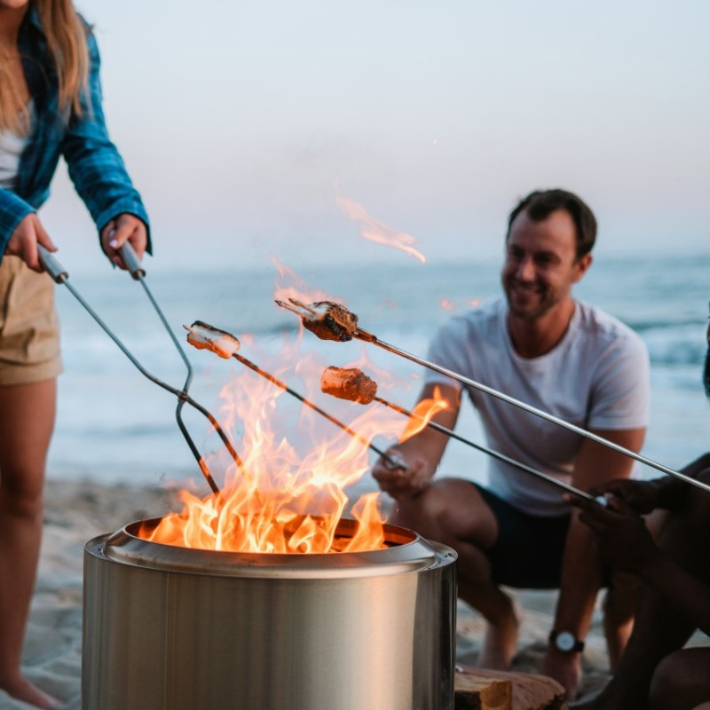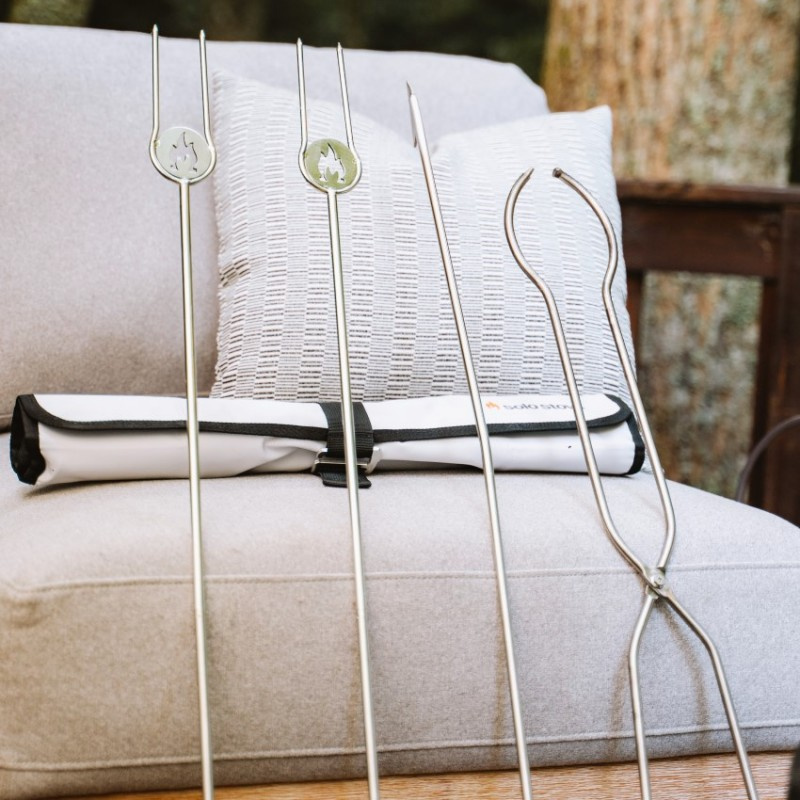 Zestaw akcesoriów do kominków bezdymnych Solo Stove pozwala w pełni wykorzystać możliwości kominka. Zawiera szpadki do grilla z ergonomicznym uchwytem, który idealnie leży w dłoni, szczypce do przenoszenia drewna i hak do bezpiecznego wyjmowania popielnika z paleniska.